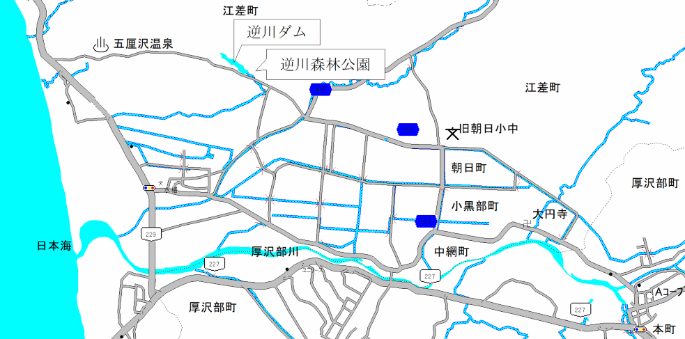 厚沢部の町と、江差の町の真ん中あたりに、1カ所だけ橋があります。基栄橋です。その橋を渡ったら右折して、7〜800mで三叉路になりますので、左折です。これで460号になりますので、あとは朝日小学校跡で左折して、その1のように進みます。