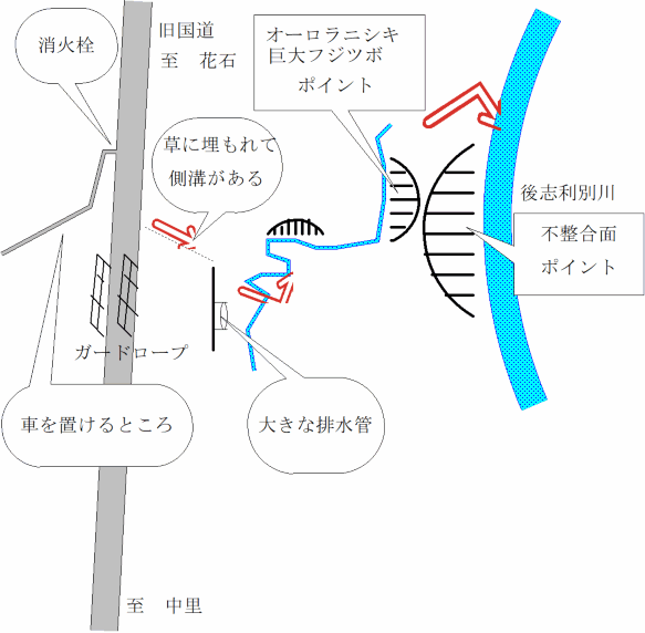 ポイントがわかりにくいところです。中里から花石方向へ向かうと、「中里7号」バス停があります。そこからさらに1.6qで、道の両側にガードロープを張ったところにさしかかります。ここがポイントです。ガードロープをすぎてすぐ左側に、消火栓があります。そこから入る林道脇に車を置かせてもらいましょう。