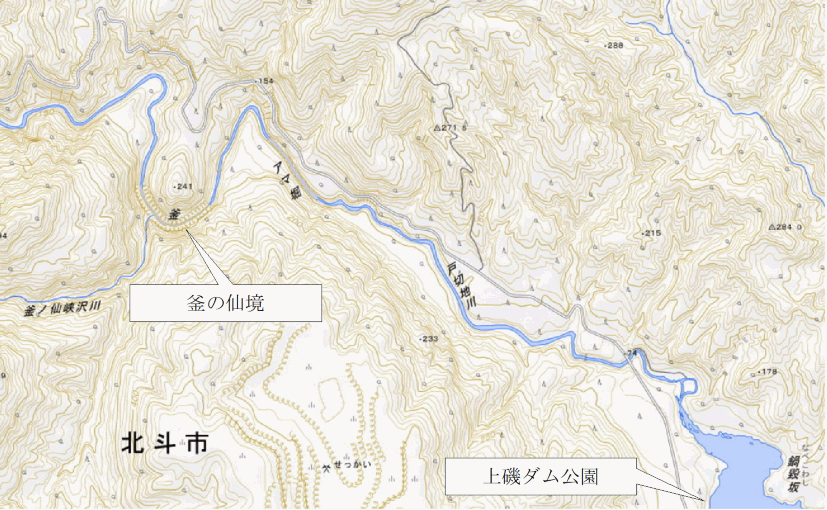 ・釜の仙境に降りるのは、上流側からが安全です。水の少ないときなら下流側へ抜けることができます。