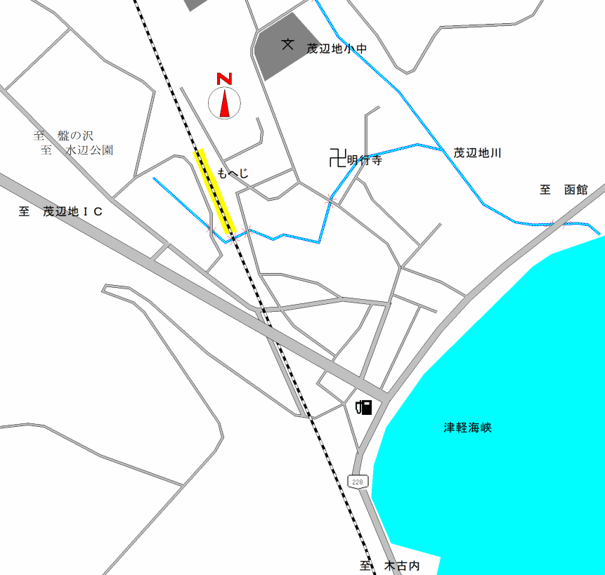 函館より上磯市街地を越え、木古内方向へ進み、茂辺地大橋を渡ったところが茂辺地市街地です。