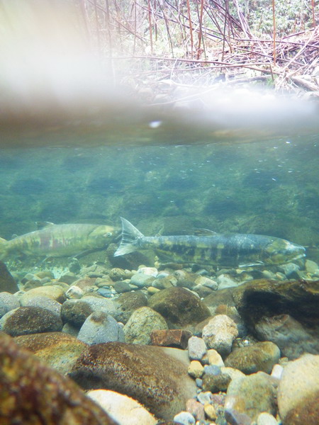 川幅が狭くなり、水深も浅いので、サケがよく見えます。
